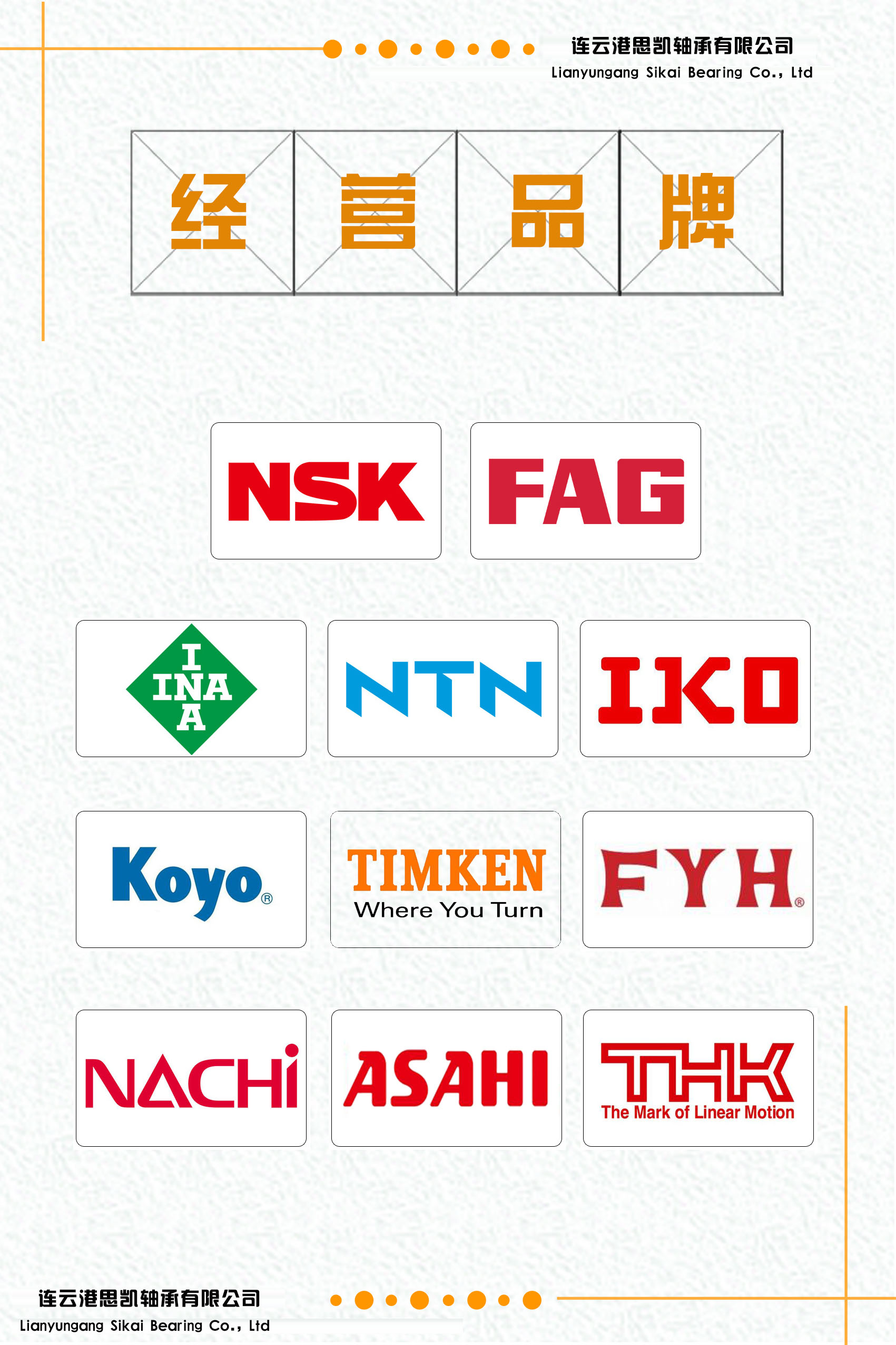 連云港思凱軸承有限公司,為您提供優(yōu)質(zhì)的進(jìn)口軸承,公司專營(yíng)品牌包括;瑞典SKF軸承,美國(guó)TIMKEN軸承,日本NTN軸承,NSK軸承,IKO軸承,KOYO軸承,NACHI不二越軸承、德國(guó)FAG軸承,INA軸承等知名品牌。