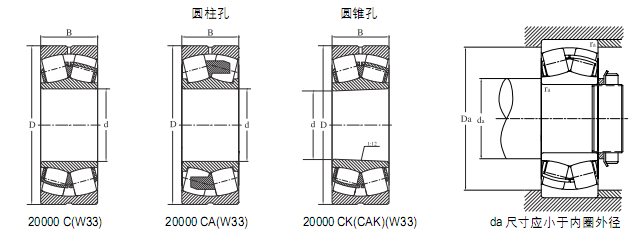 調(diào)心滾子軸承其內(nèi)孔有圓柱形和圓錐形兩種,圓錐形錐孔錐度為1:30 和1:12兩種,這種圓錐形內(nèi)孔軸承配以緊定套或退卸套,即可將錐形內(nèi)孔調(diào) 心球軸承方便、迅速地裝配在光軸或階梯機(jī)軸上。
