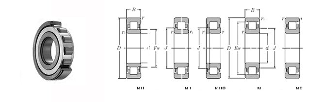 NJ型軸承的外圈兩側(cè)有擋邊,內(nèi)圈單側(cè)有擋邊。可以承受一定量的單向軸向負(fù)荷。NF型的外圈單側(cè)有擋邊,內(nèi)圈兩側(cè)有擋邊。也可承受一定量的單向軸向負(fù)荷。因此,該類結(jié)構(gòu)適用于作為單方向的軸向定位軸承用。